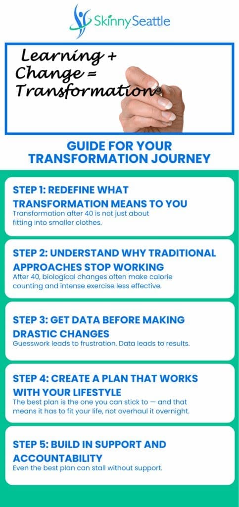 This guide will walk you through the key steps to starting your own transformation journey after 40, using the same principles that have helped Skinny Seattle clients find lasting health, energy, and confidence.